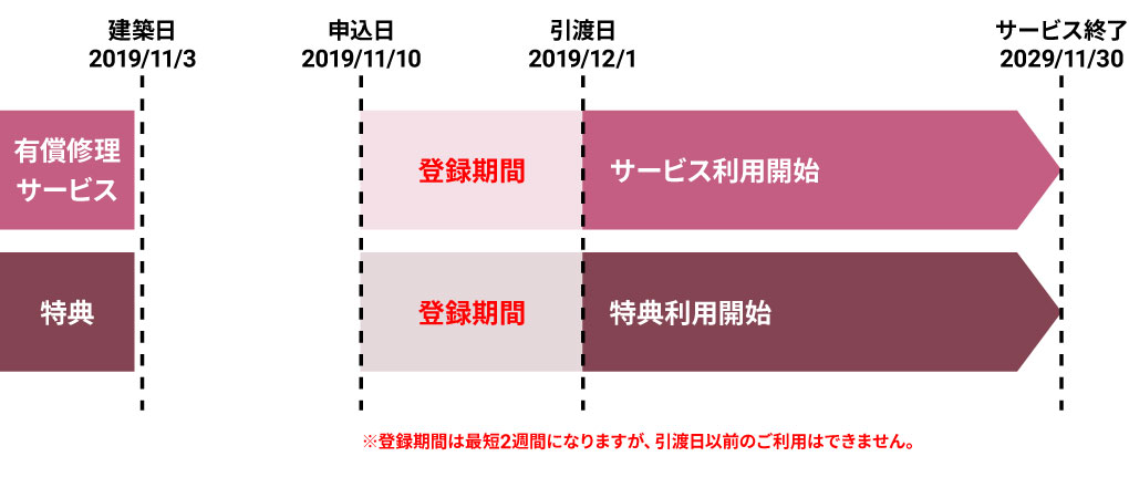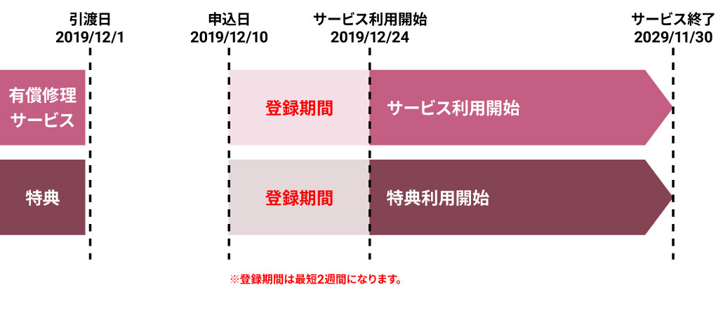 ※例②:12月1日が引渡日で、12月11日に登録完了通知書が発送された場合、12月18日からご利用できます。