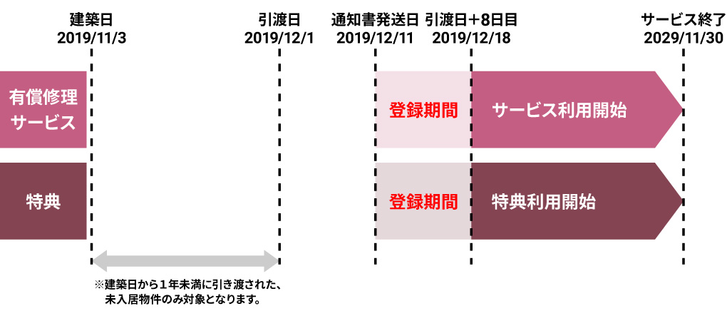 ※例②:12月1日が引渡日で、12月11日に登録完了通知書が発送された場合、12月18日からご利用できます。
